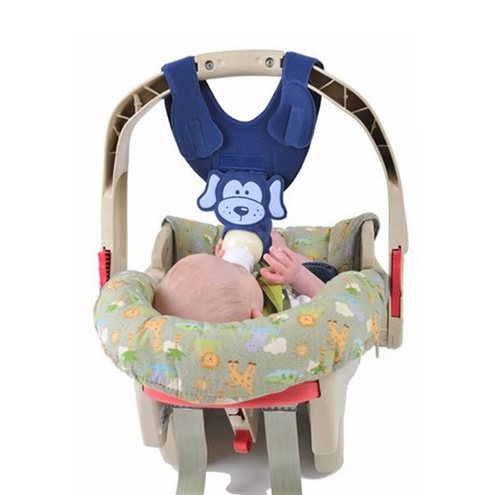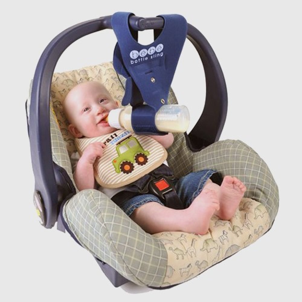 The Baby Bottle Holder is designed to hang from any infant car seat handle while holding the baby bottle at the correct position for hands free bottle feeding.
